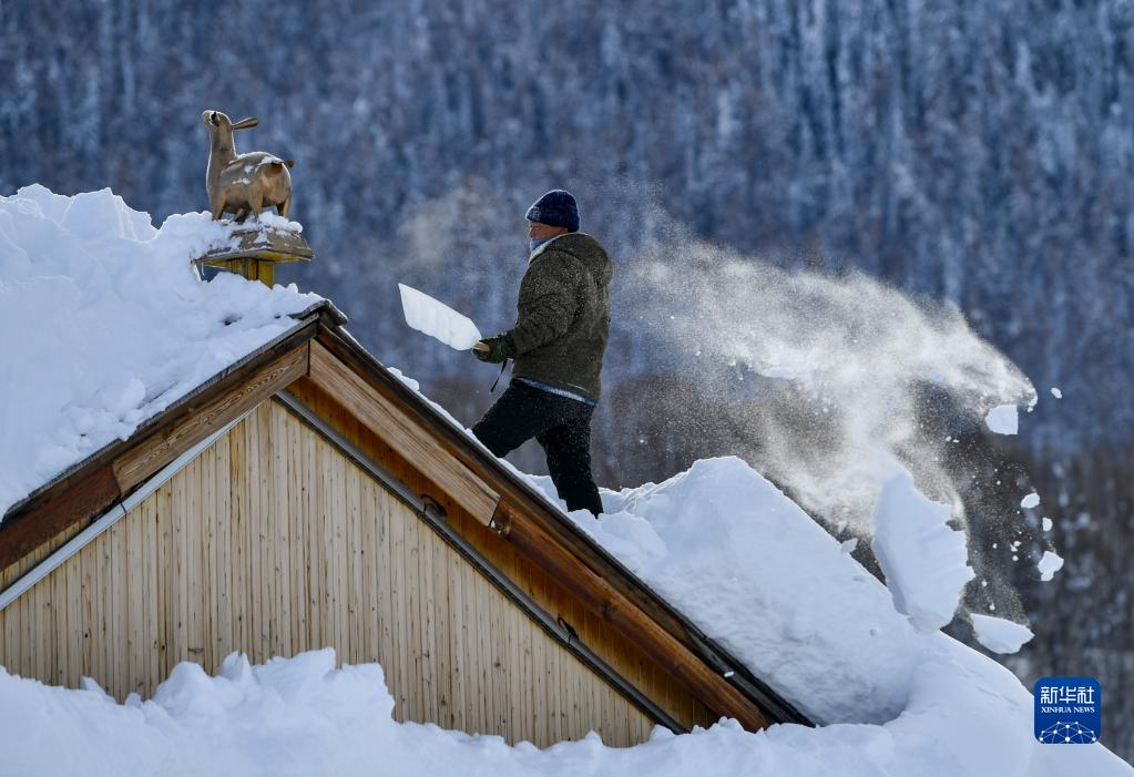 新疆阿勒泰地區禾木村的村民在清掃屋頂上的積雪(1月14日攝)。