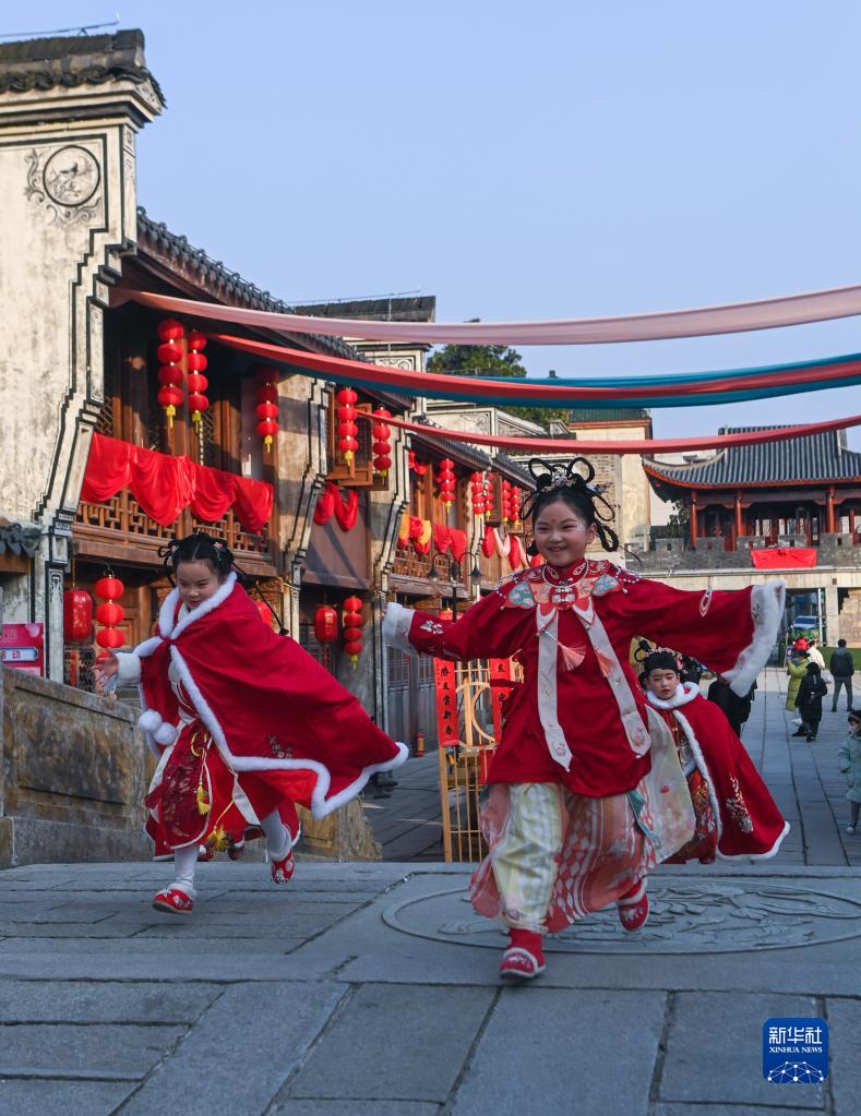 1月16日,身著傳統服飾的孩子在新登鎮宋韻文化特色街區嬉戲。