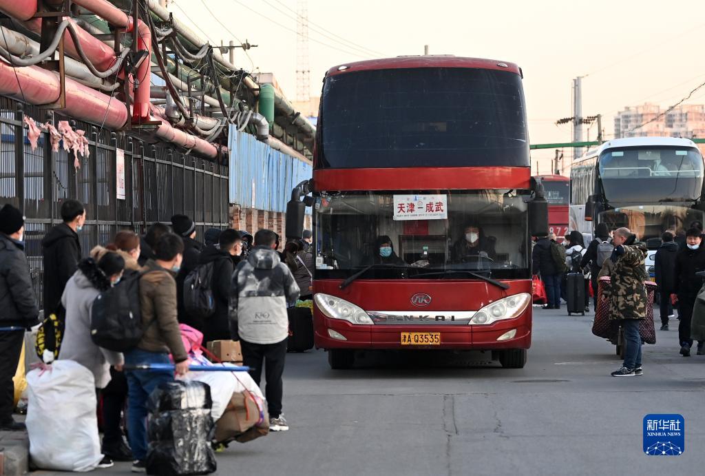 1月16日,返鄉(xiāng)工人在天津市北辰區(qū)宜興埠鎮(zhèn)準備登車返鄉(xiāng)。
