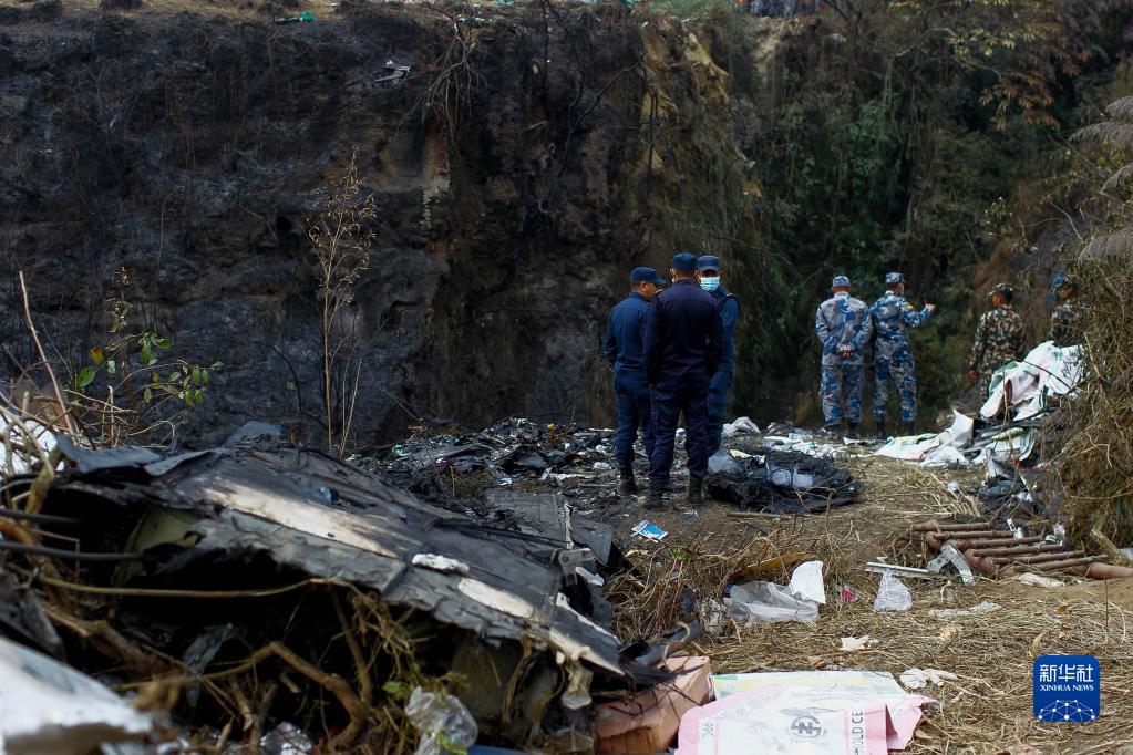 1月16日,救援人員在尼泊爾博克拉地區(qū)墜機(jī)現(xiàn)場工作。