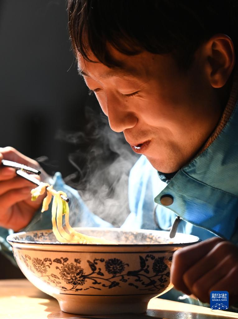 一上午忙碌過后,李文在西安市灞橋區(qū)一家面館吃午餐(1月18日攝)。