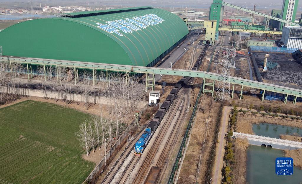 1月19日,在中煤新集能源股份有限公司劉莊煤礦,滿載電煤的專列駛出礦區(無人機照片)。