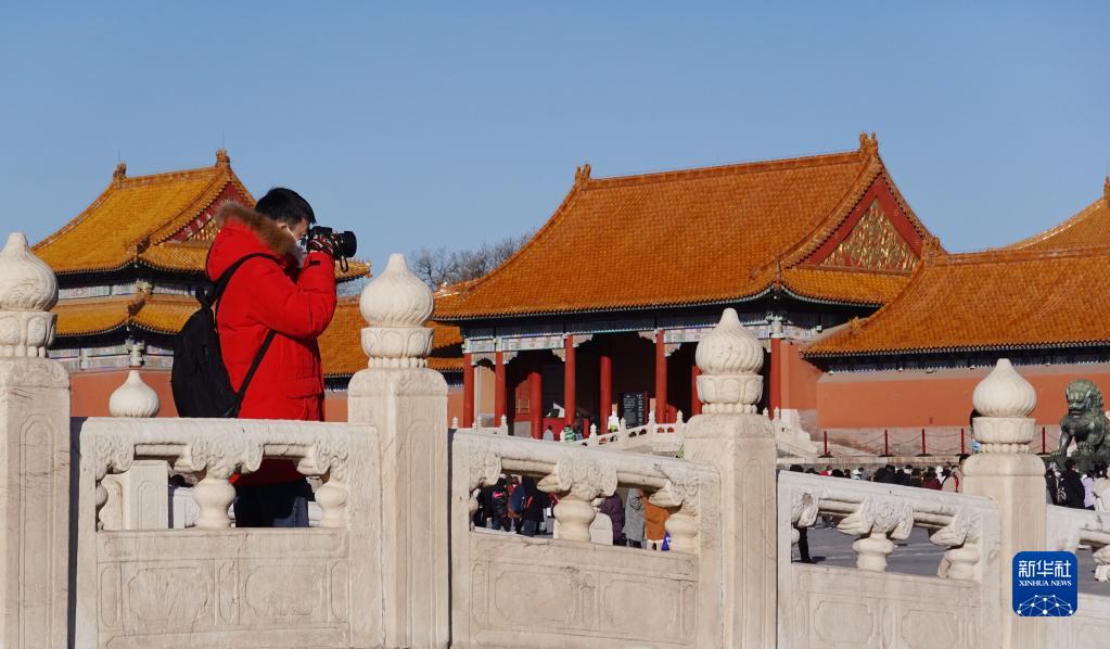 春節前夕,不少游人來到北京故宮博物院,在藍天暖陽下感受冬日故宮的獨特韻味。