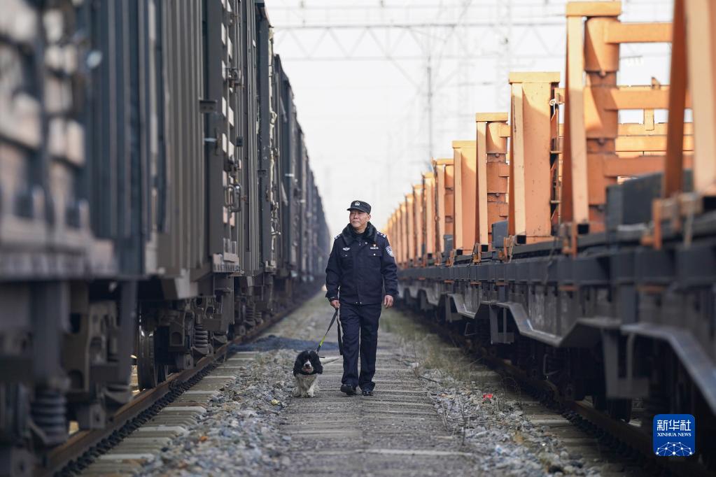 1月18日,民警王支斌和警犬“和平”在車站內巡邏。