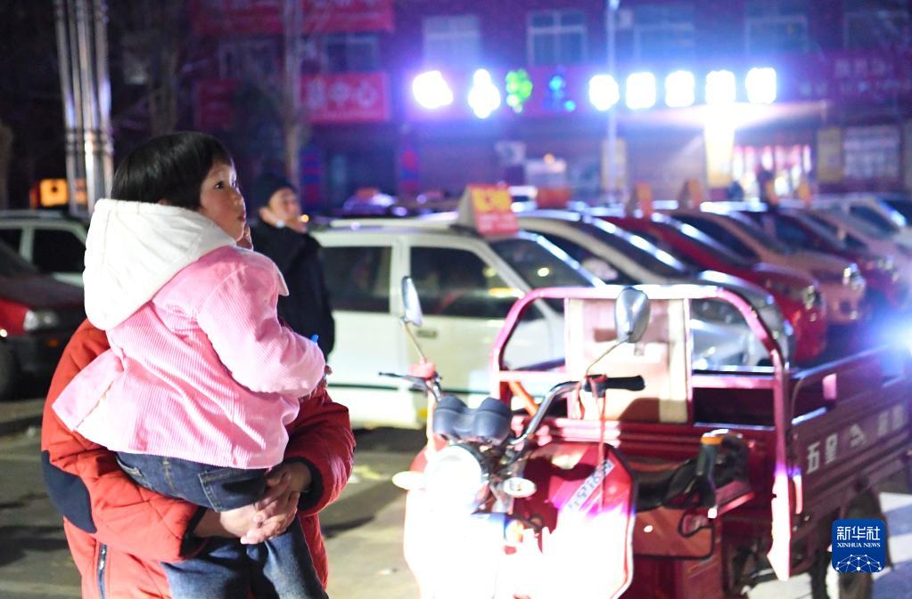 1月18日晚,女兒靳佳穎和爺爺奶奶來到村廣場,等候父母返鄉(xiāng)乘坐的長途大巴。