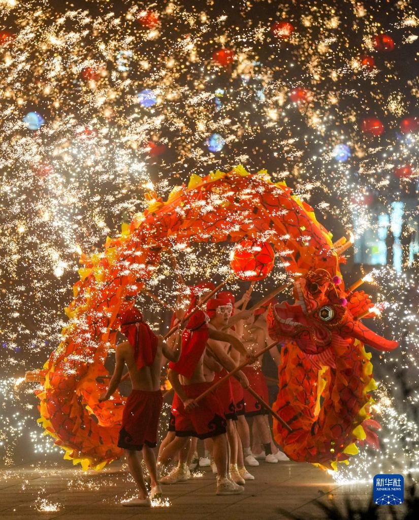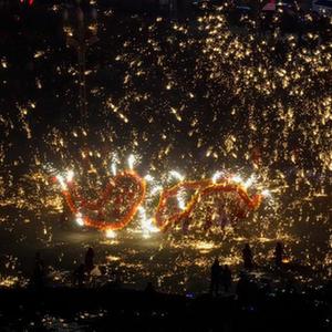 1月18日,重慶市銅梁區的龍城天街的廣場上,銅梁火龍隊的隊員們表演銅梁火龍。