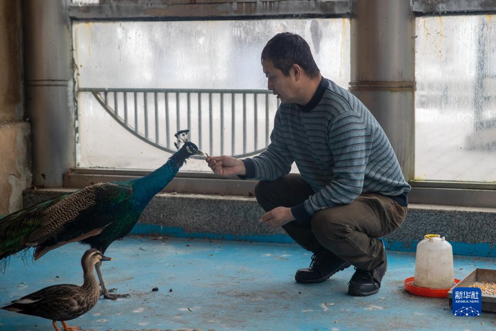 1月21日,在黑龍江省哈爾濱市兆麟公園,工作人員車春虎在照料孔雀。