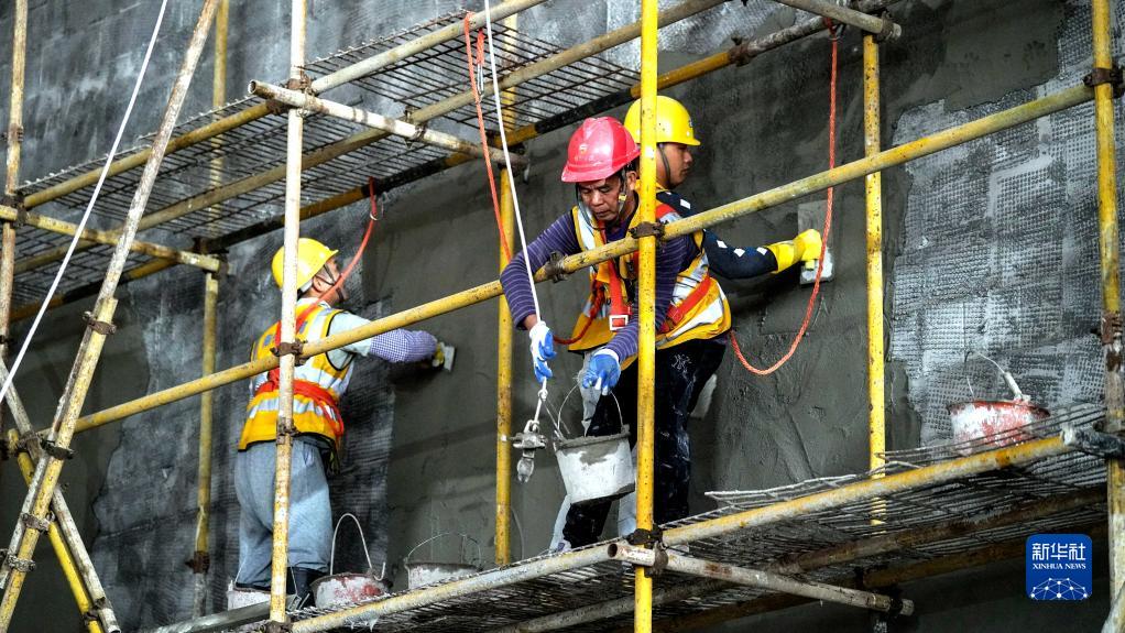 1月21日,在南寧國際鐵路港電商物流區建設工地,工人在對倉庫內墻進行批灰作業。