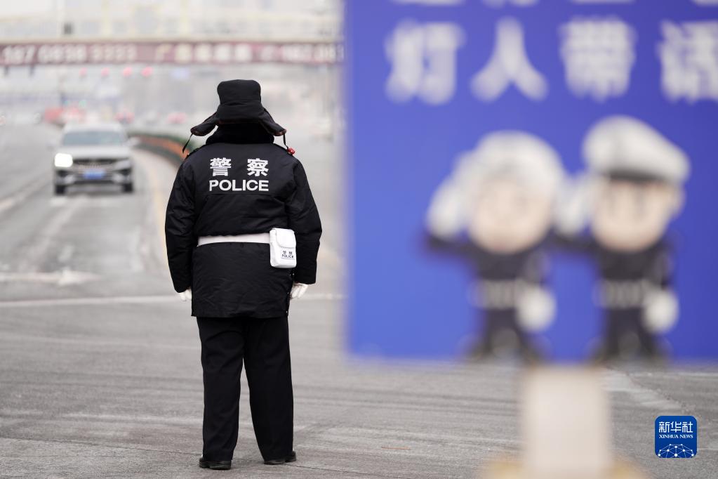 1月21日,在哈爾濱市中山路,一名協警在寒風中堅守崗位。