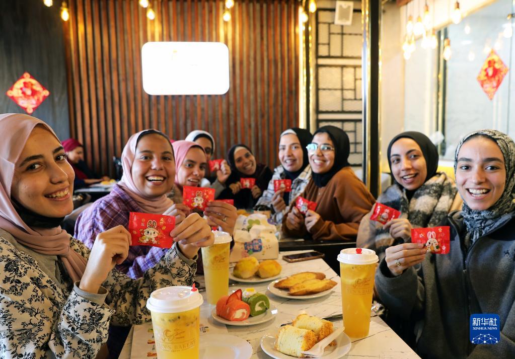 1月18日,顧客在位于埃及首都開羅的一家烘焙坊內感受中國春節氛圍。臨近中國農歷春節,這家烘焙坊推出兔年春節主題裝飾與商品,增添節日氣氛、吸引消費者。