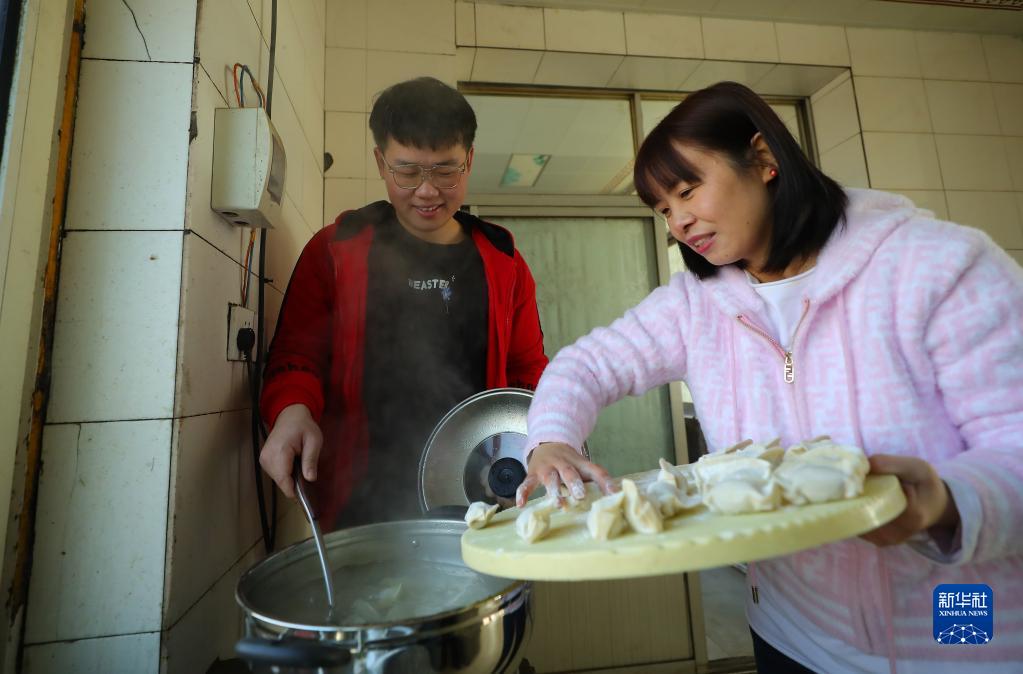 1月20日,沈陽工學院老師和李天騏(左)一起煮餃子。