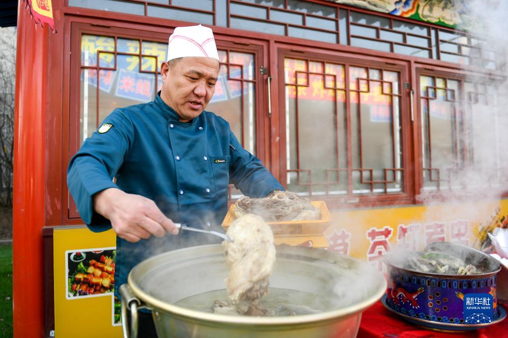 1月21日,廚師在惱包村美食街燉手扒肉。