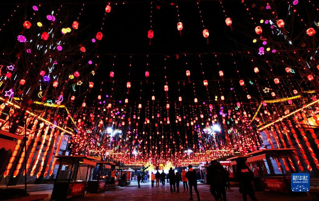1月17日晚,游客在山東省臨沂市郯城縣郯國古城景區(qū)觀賞彩燈。