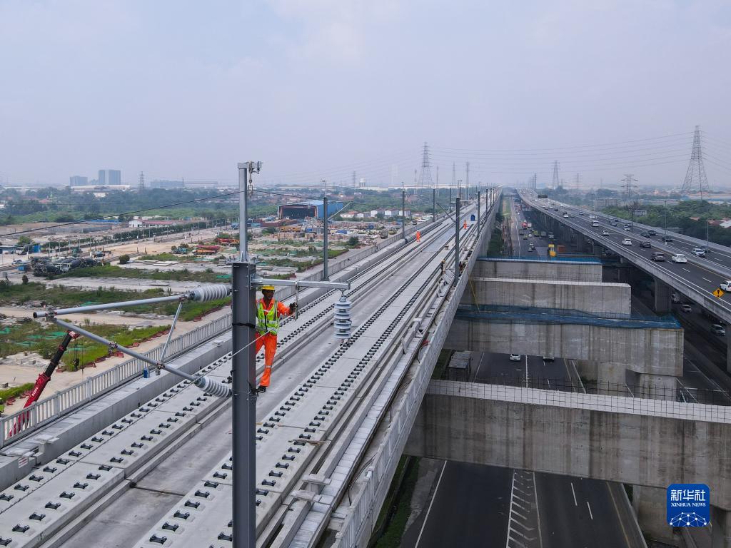 1月21日,在印度尼西亞勿加泗雅萬高鐵沿線,中鐵電氣化局印尼雅萬高鐵項目部施工人員進行高鐵接觸網附加線架設工作(無人機照片)。