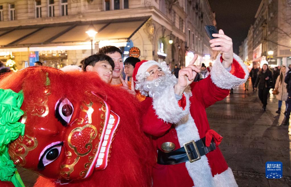 1月21日晚,在塞爾維亞首都貝爾格萊德舉行的“歡樂春節——絲綢之路上的友誼大篷車”活動上,當地一名圣誕老人裝扮者與舞獅表演者合影。