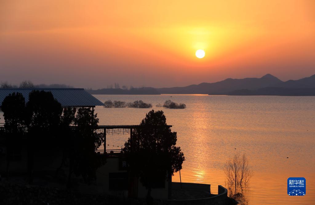 1月22日在河北省平山縣西柏坡崗南水庫(kù)拍攝的日出。