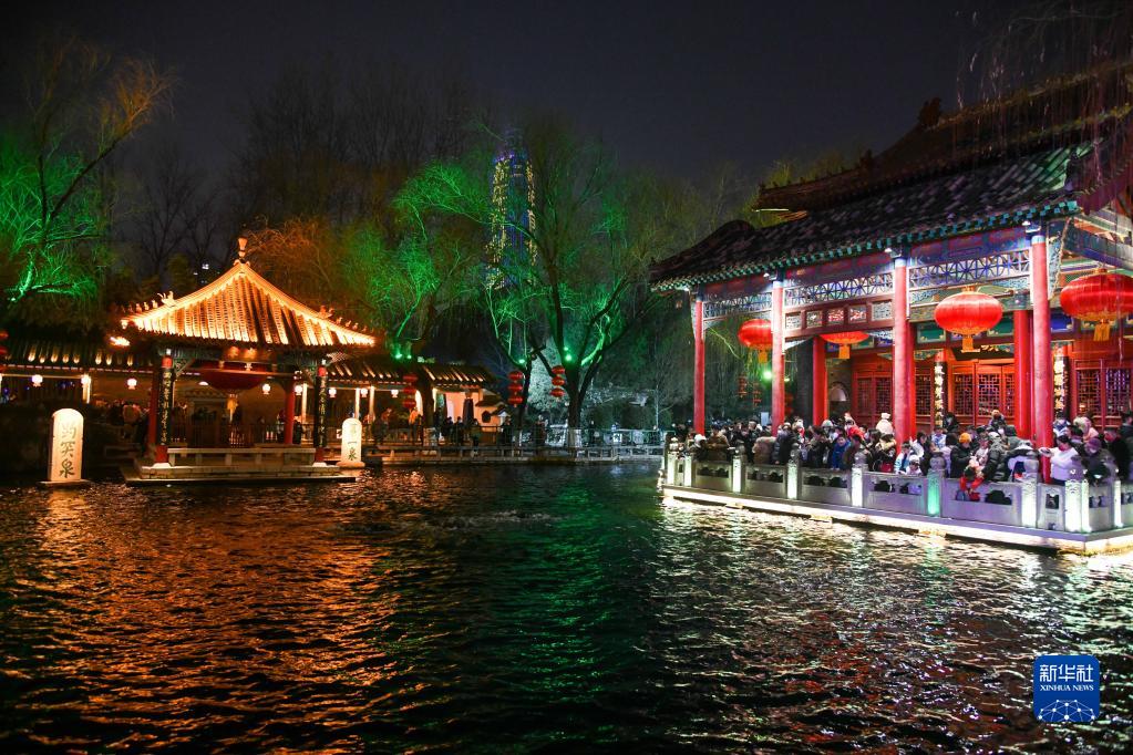 1月22日,游人在濟(jì)南趵突泉公園內(nèi)參觀噴涌的趵突泉水。