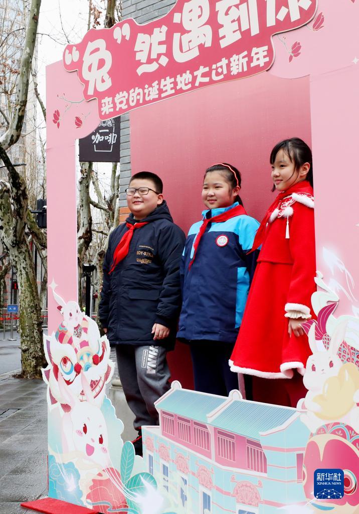 1月22日,少先隊員在上海中共一大紀念館門前的節日主題相框內合影。