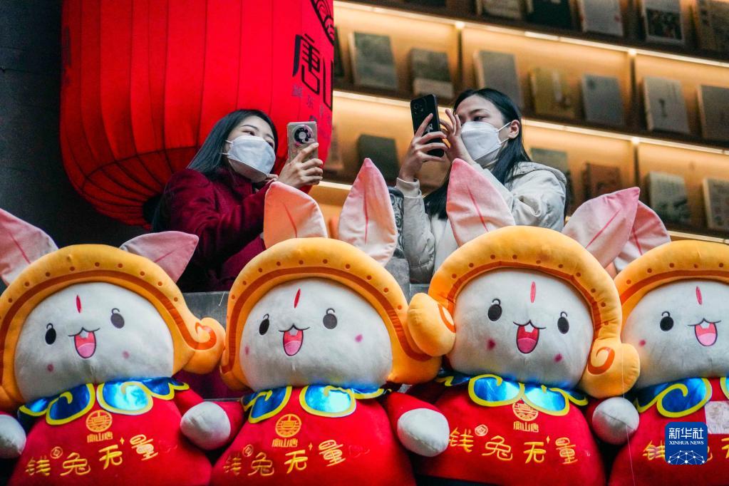 1月22日,游客在河北省唐山市唐山宴美食街生肖兔擺件旁拍照。
