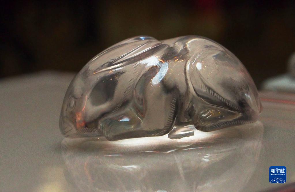 在上海博物館拍攝的元代水晶兔(1月22日攝)。元代水晶兔于1994年在上海市松江區(qū)圓應(yīng)塔地宮出土。兔雙眼為圓圈狀,眼梢線向左右延伸,抿嘴,鼻子、胡須和四爪均用陰刻粗線條勾勒,兔毛以平行的細(xì)短陰線刻飾,裝飾性強(qiáng)。腹背豎穿一孔,可系可佩。整體似作覓食狀,質(zhì)樸敦實(shí)、憨態(tài)可掬。