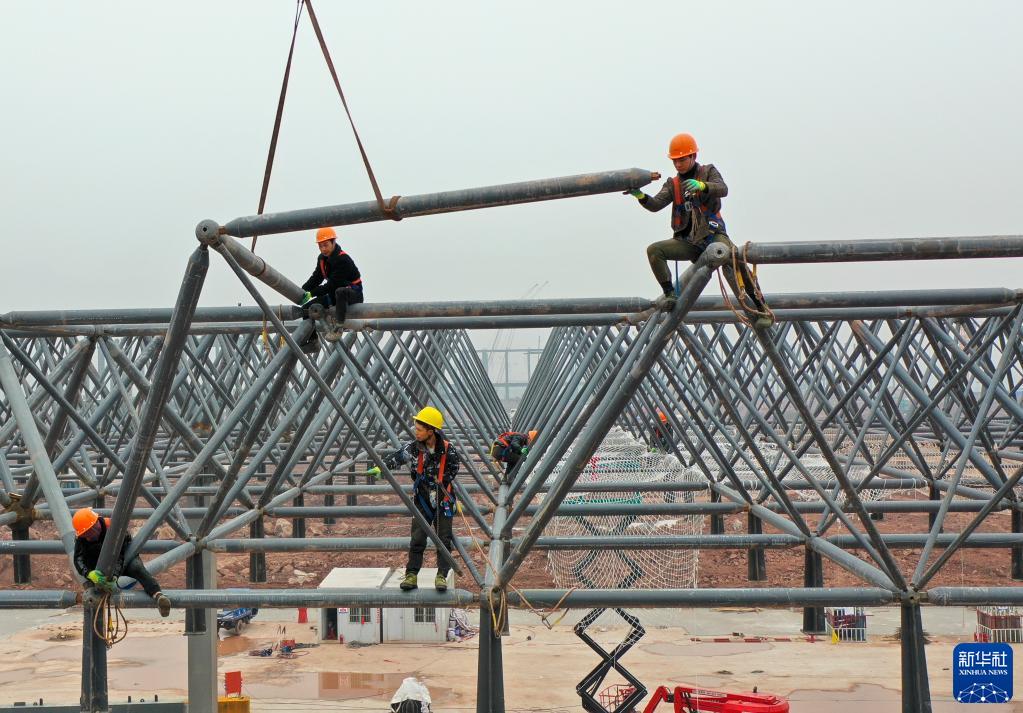 1月23日,在重慶兩江新區新能源汽車產業園基礎設施配套項目現場,工人在進行鋼結構施工作業(無人機照片)。