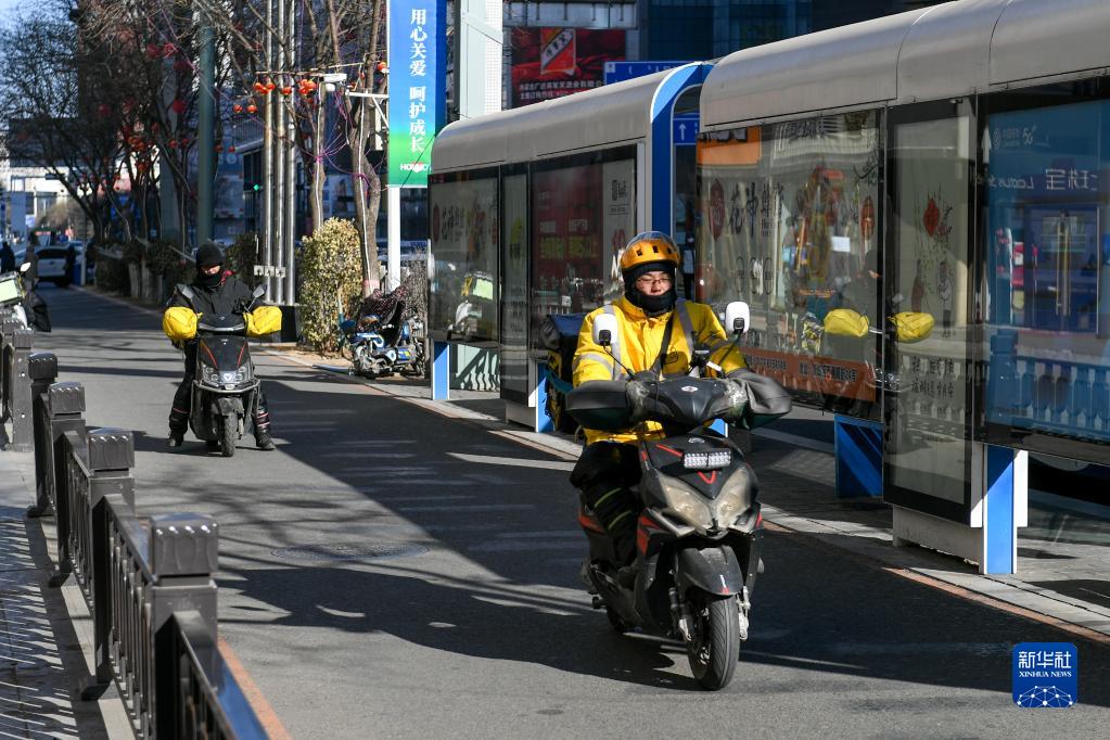 1月23日,一名外賣騎手在內(nèi)蒙古呼和浩特市中山西路騎行。