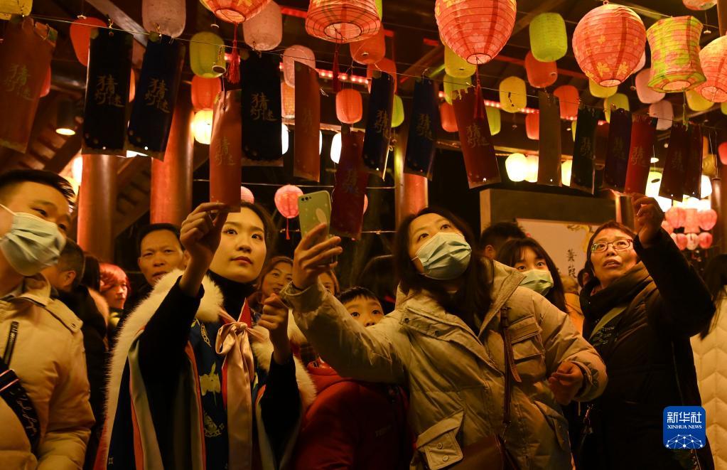 1月22日,游客在四川省南充市蓬安縣相如故城猜燈謎。