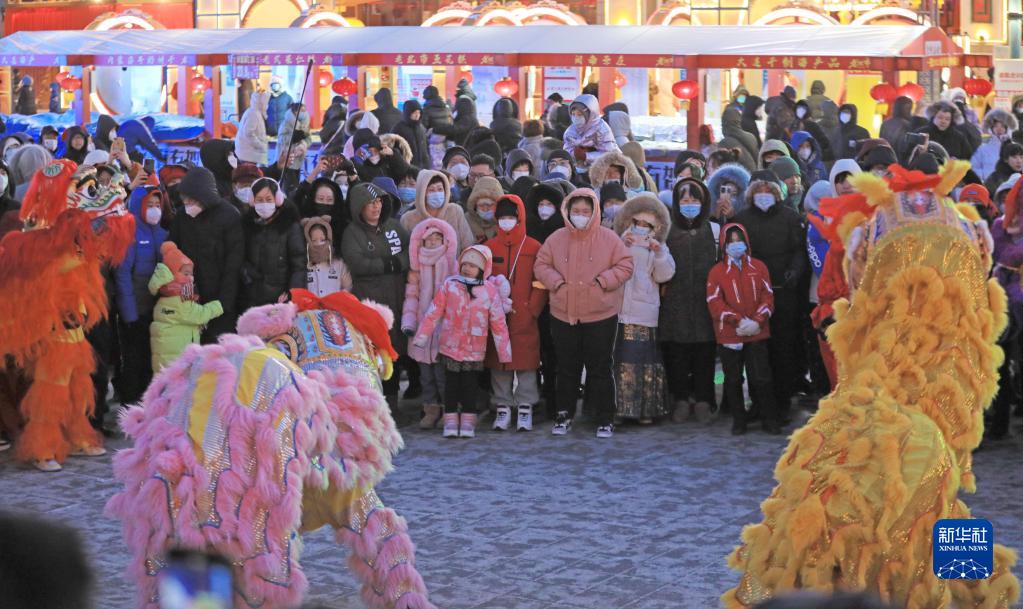 1月23日,市民在沈陽新春皇寺廟會上觀看舞獅表演。