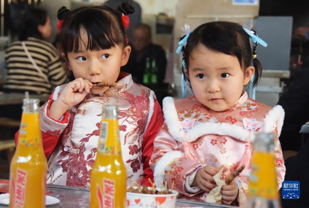 1月22日,在云南省紅河哈尼族彝族自治州個舊市一燒烤攤,兩名小女孩在享受美食。
