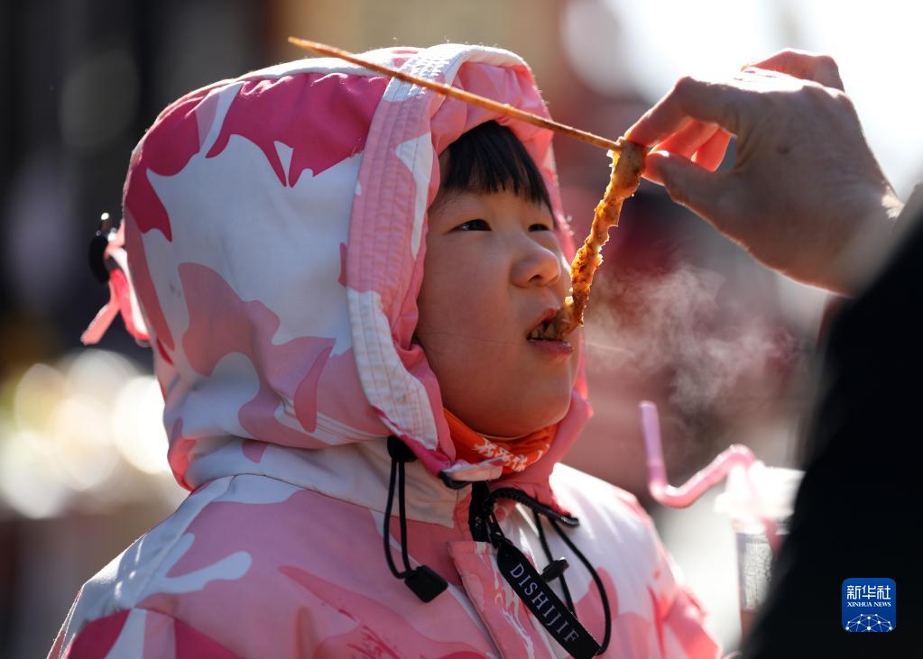 1月24日,在山東省臨沂市郯城縣郯國古城景區美食街,一名小女孩在品嘗美食。