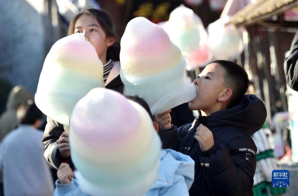 1月24日,在河北省石家莊市鹿泉區土門關驛道小鎮,小朋友品嘗棉花糖。