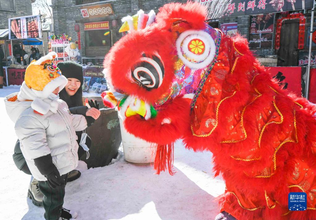 1月24日,在位于河北省遵化市的唐山尚禾源旅游景區,舞獅演員與一名小游客互動。