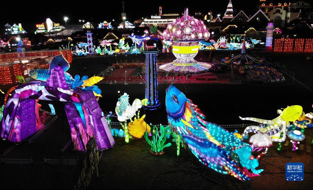 1月24日在青島金沙灘啤酒城內(nèi)拍攝的海洋主題彩燈(無人機(jī)照片)。
