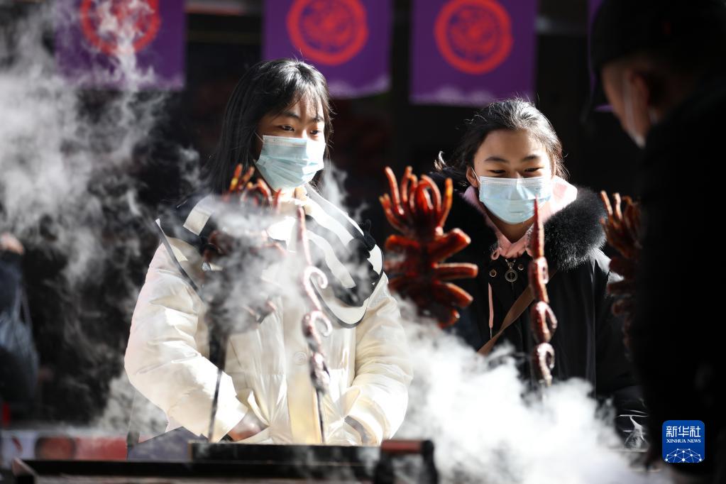 1月25日,游客在山東省臨沂市郯城縣郯國古城景區美食街購買美食。
