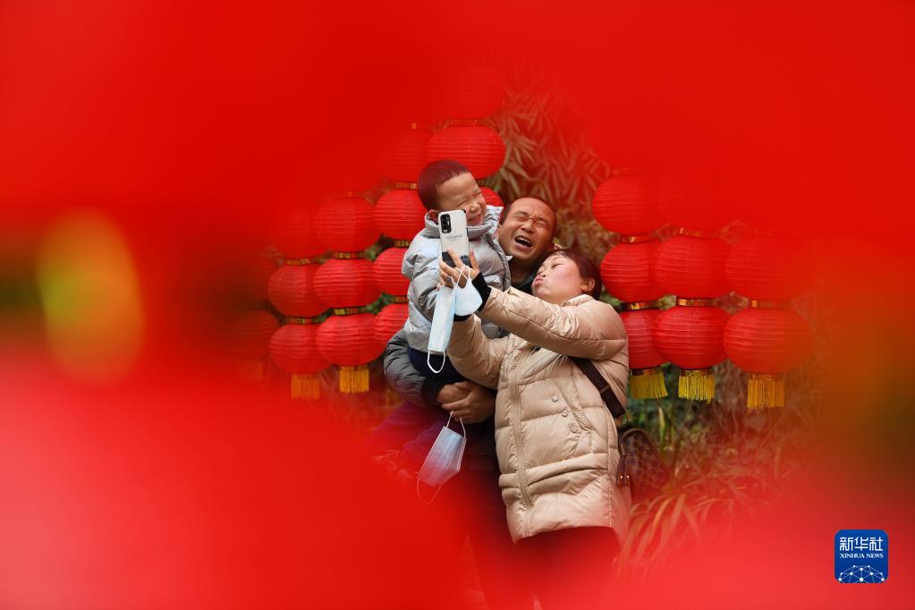 1月25日,游客在貴州省貴陽市云巖區黔靈山公園“爽爽貴陽”首屆春節大型市集廟會上拍照留影。