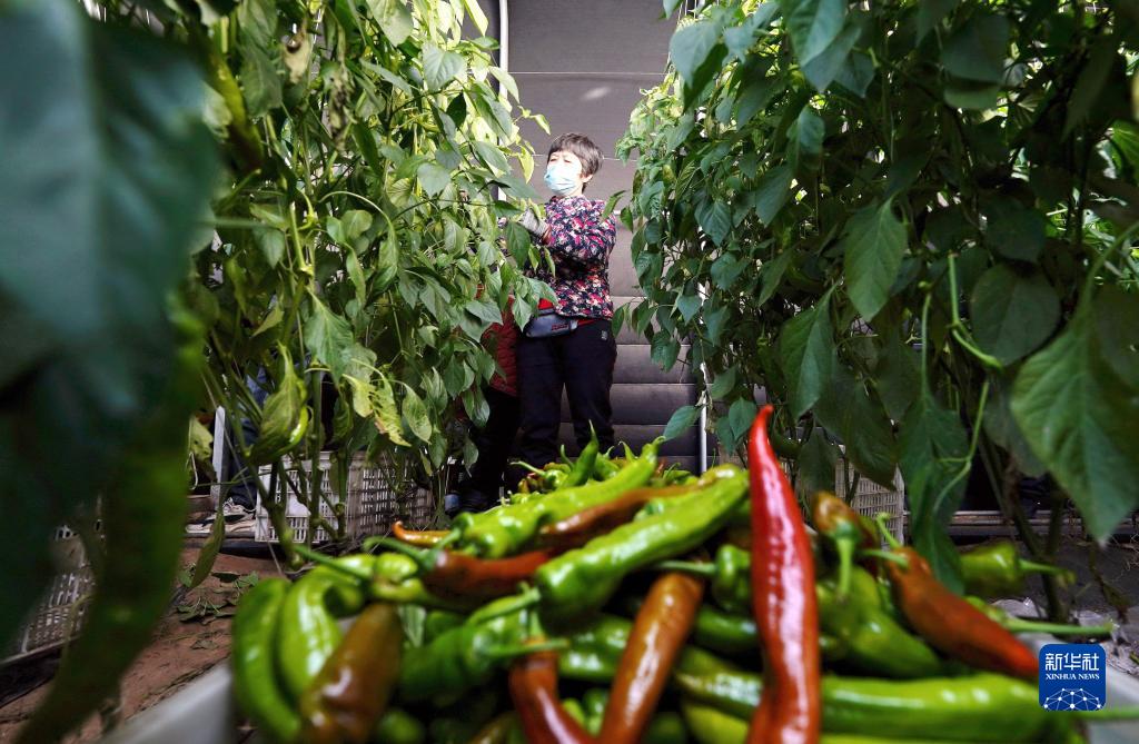 1月25日,河北省灤州市茨榆坨鎮的農民在大棚里采摘辣椒。