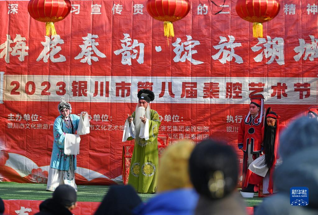 1月25日,演員在寧夏銀川市賀蘭縣潤園文化廣場為戲迷表演秦腔劇目《烙碗記》。