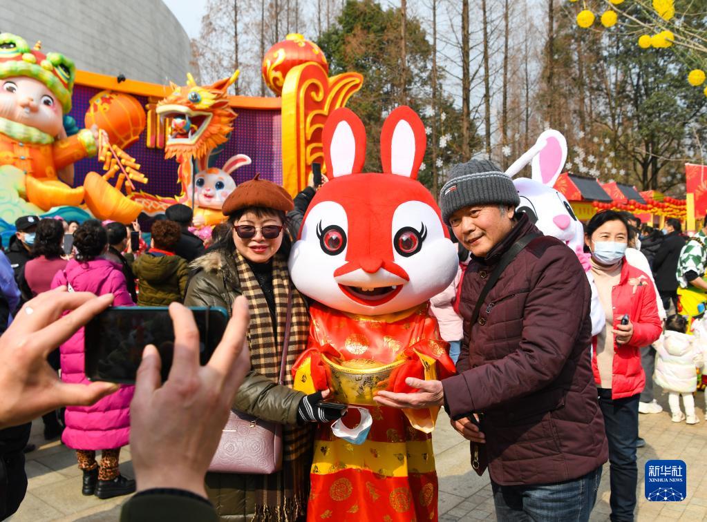1月25日,在四川成都2023金沙太陽節活動現場,游客和“招財兔”合影。