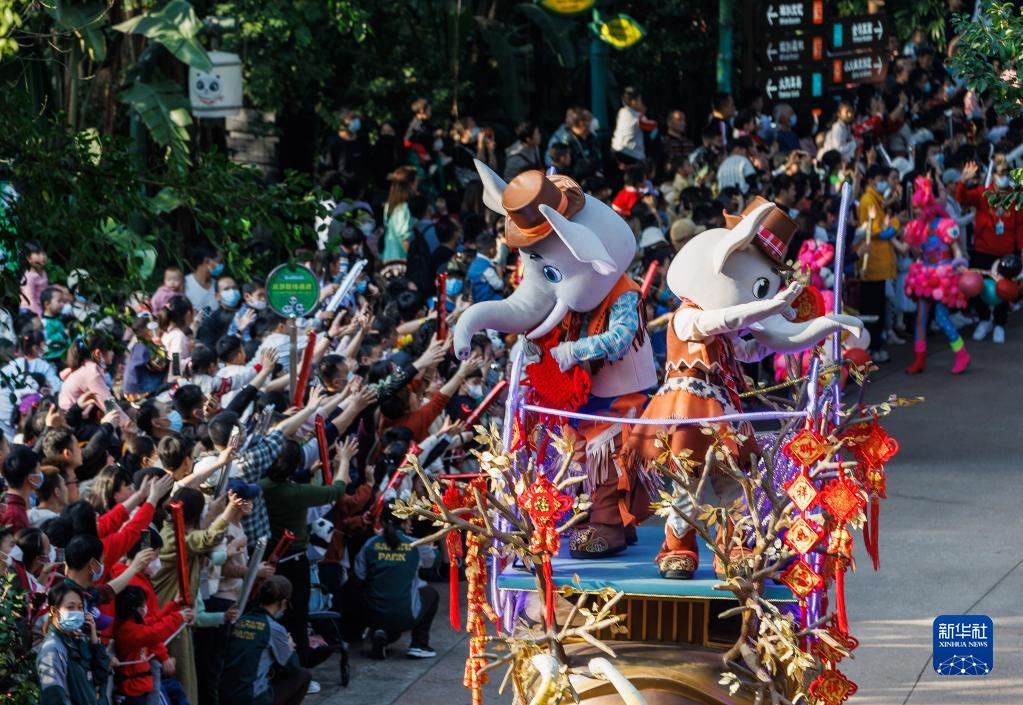 游客在廣州長隆野生動物世界觀看新年花車巡游(1月22日攝)。