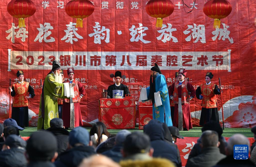 1月25日,群眾在寧夏銀川市賀蘭縣潤園文化廣場觀看秦腔劇《烙碗記》。