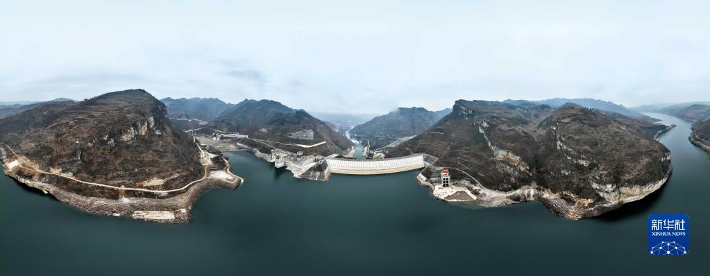 1月25日,貴州省畢節市夾巖水利樞紐工程庫區風光如畫(無人機全景照片)。
