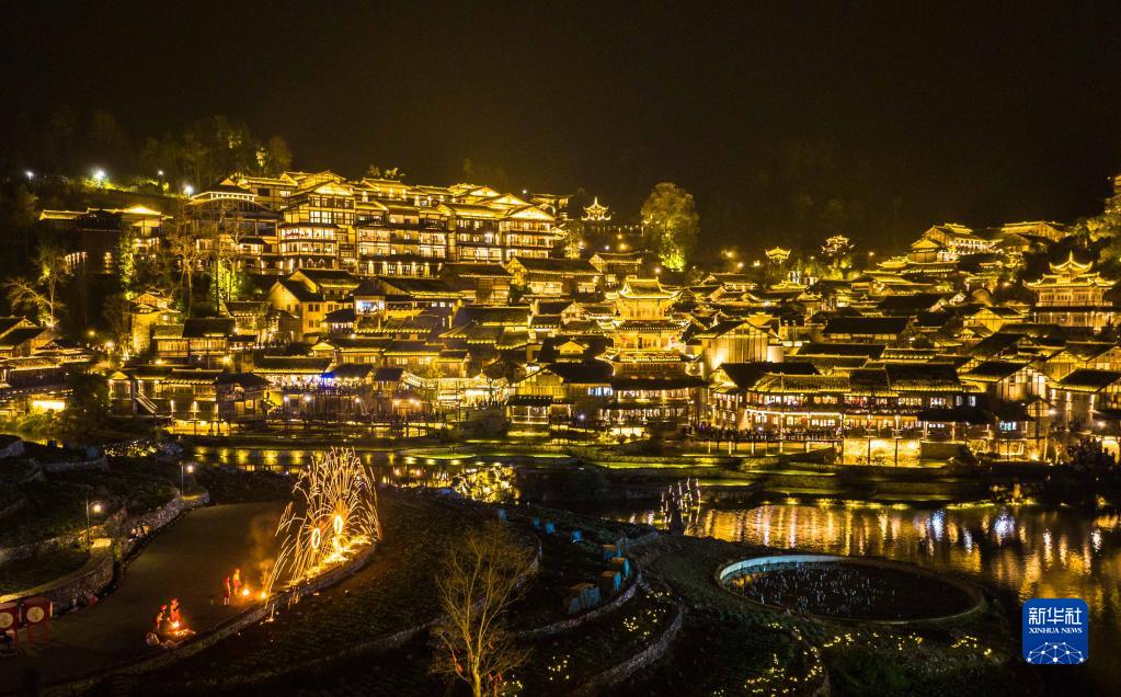 1月24日拍攝的貴州省遵義市烏江寨景區的打鐵花表演(無人機照片)。