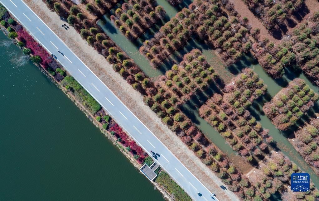 位于云南省曲靖市的麒麟水鄉水杉林一景(1月25日攝,無人機照片)。