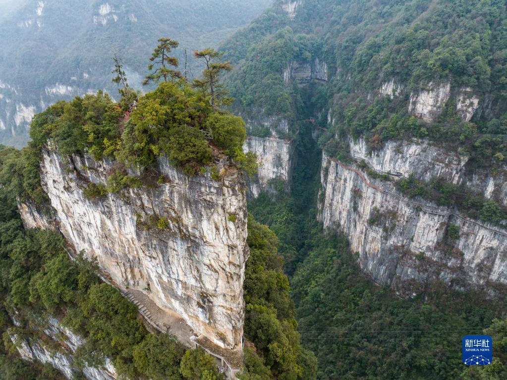 1月25日,在貴州省畢節(jié)市大方縣油杉河景區(qū)拍攝的仙宇屯景點(diǎn)(無人機(jī)照片)。