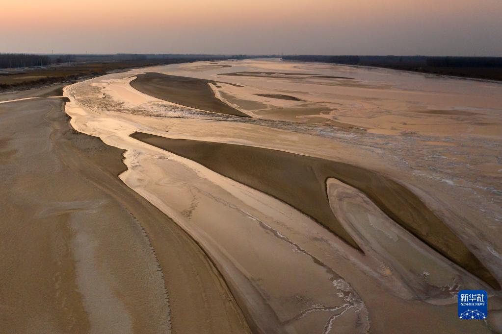 1月25日,落日余暉中,黃河山東高青段流凌與河汊交織,姿態(tài)萬千(無人機(jī)照片)。