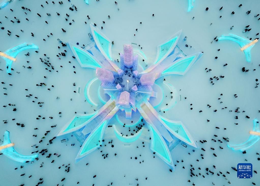 1月25日,游客在哈爾濱冰雪大世界園區(qū)內(nèi)游玩(無(wú)人機(jī)照片)。
