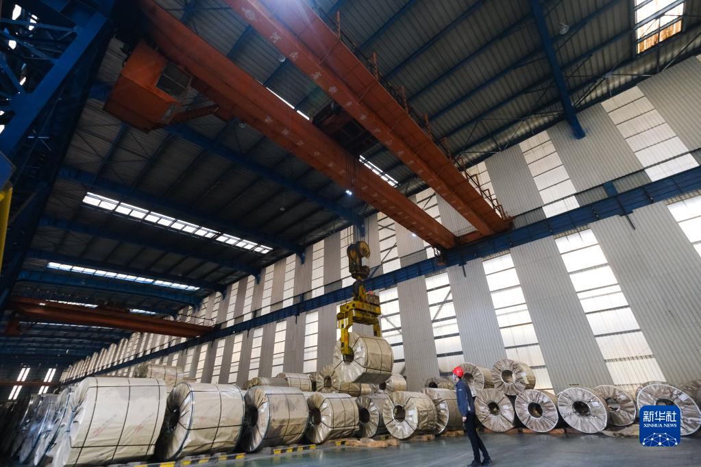 1月26日,在位于嘉興市南湖區新豐鎮的振石集團東方特鋼有限公司成品庫,工人在裝吊擺放成品鋼卷。