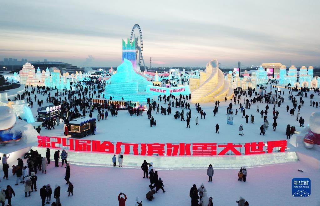 1月25日,游客在哈爾濱冰雪大世界園區游玩(無人機照片)。