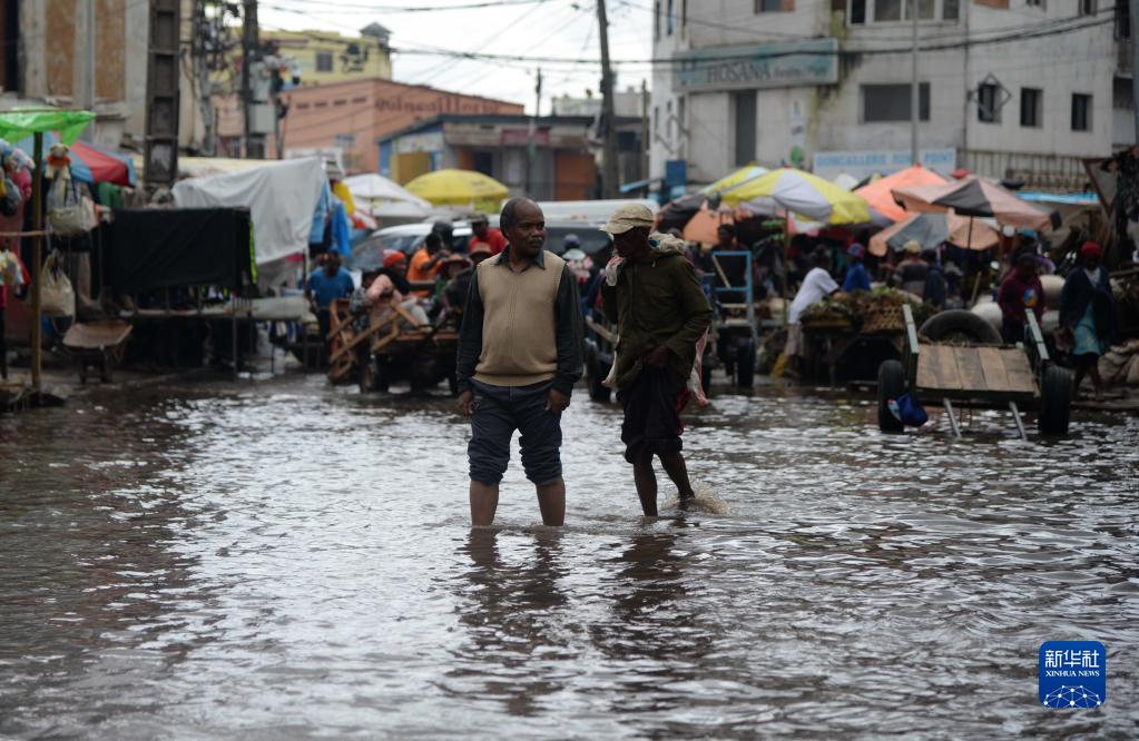 1月25日,在馬達加斯加首都塔那那利佛,行人走過積水的道路。
