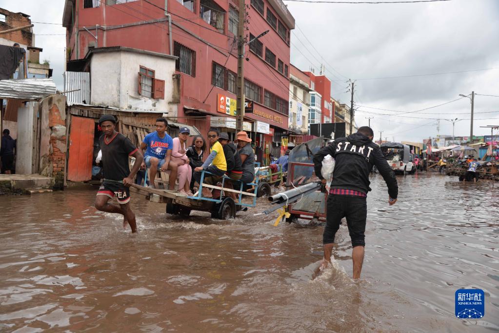 1月25日,在馬達加斯加首都塔那那利佛,行人走過積水的道路。